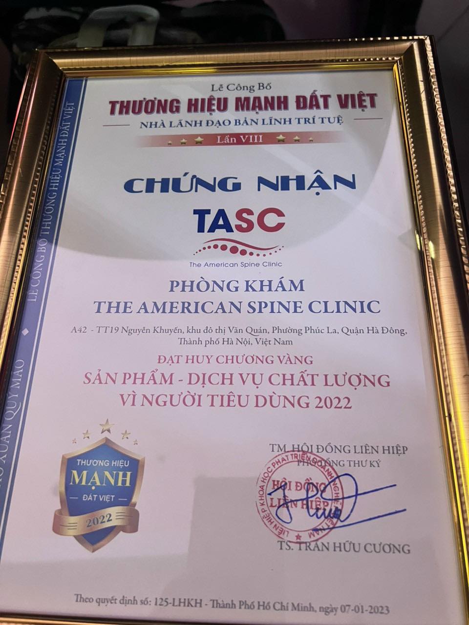 Thật vinh dự, phòng khám TASC của Tiến sĩ bác sĩ Lê Đình Bảo (David Le) và cộng sự đã vinh hạnh nhận chứng nhận thương hiệu mạnh 2022. Đây là giải thưởng ghi nhận những thành tích đạt được trong quá trình hoạt động, vận hành và lãnh đạo của phòng khám xương khớp TASC.